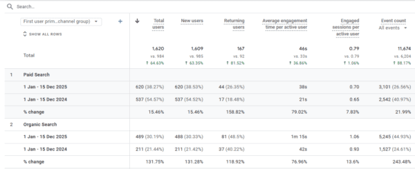The Story: Organic search traffic more than doubled year-over-year. This is the compounding asset at work. Those suburb pages, equipment pages, and service pages are now ranking, driving traffic, and generating leads without ongoing content costs.